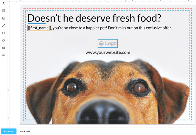 Once you've selected what you want to put in your template a placeholder shows up in your design. This will be replaced with customer-specific data when your postcards are printed.